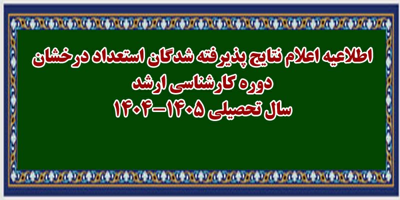 در این اطلاعیه آمده است: نتیجه بررسی پرونده داوطلبان پذیرش بدون آزمون استعدادهای درخشان دوره کارشناسی ارشد سال تحصیلی ۱۴۰۵- ۱۴۰۴ دانشگاه اعلام شد.